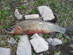 The cutthroat in this lake are plentiful and you can sight fish when the wind is calm. The fish in this lake are nicely sized with the complete variety of sizes from minnows up to the 15" fish above and perhaps higher.