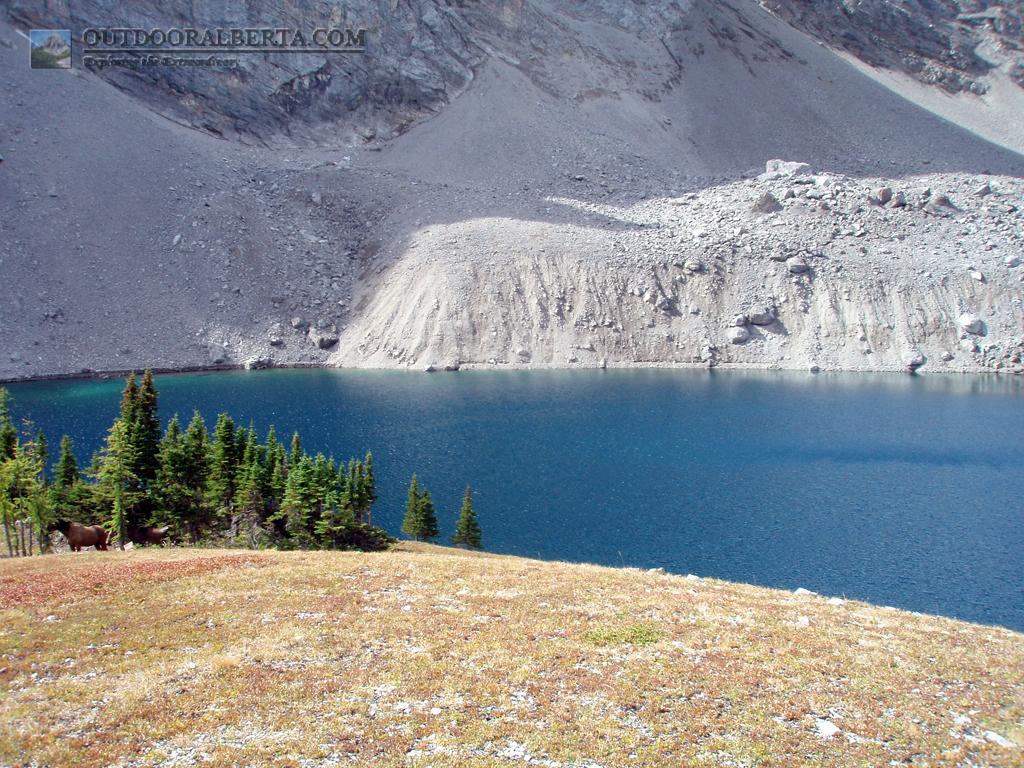 Loomis Lake is a blue color and the water is clear. You have to cross the Highwood River and then Loomis Creek five times, both can be swift in the spring and earlier in the summer. Its best to take a bike up park way though as the trail is long for a trip. As usual with lakes in this area the trail follows a steep headwall up to the lake