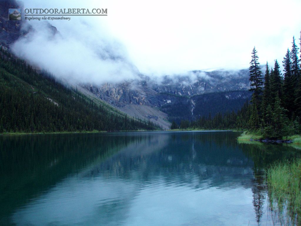 Luellen Lake located in Banff National Park along the Johnson Creek Trail. A backcountry campground is located on its shore for those wishing to stay. The warmer waters in this lake are clear with a somewhat shallower shore.
