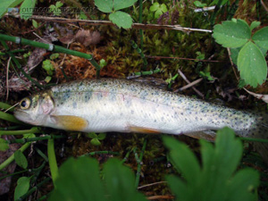 While the cutthroat in this lake are present in larger numbers it was very hard lake to fish on both my visits. They really don't bite hard often spitting out the hook. Not only that but the fish don't seem to get very large in here so largest I caught was just less than 12". I find it suitable to show the picture of the juvenile above as there are lots of these. The fish in this lake are naturally reproducing so they are of all sizes. They updated the regulations from 40cm to 30cm as there probably wasn't anything 40cm in present anyway.