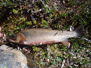 There are plenty of Cutthroat in these lake however I didn't find anything over 12". Both are naturally reproducing lakes with outlet streams full of small fish. Fishing was slow at best. The fish in the upper lake seemed to stay in the middle of the lake which was beyond casting range. The lower was similar but a bit better.