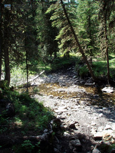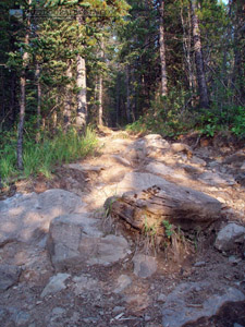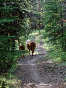 After the Volcano Trails you hit Threepoint trail which is a singletrack trail which will be a tough ride when wet which I wouldn't recommend.. Even in a dry summer it will have wet spots. Watch out for cows on this trail too. Toward the end of Threepoint trail you hit a nice viewpoint (above) of Elbow Valley below. There is a nice and fun bit of technical downhill (right) before you cross the riverbed and finish on Big Elbow Trail. |